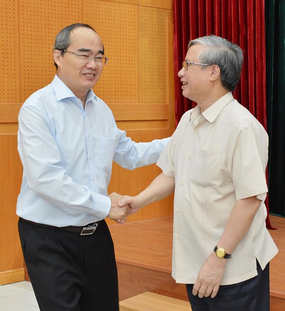 Bí thư Thành ủy TPHCM Nguyễn Thiện Nhân phát biểu tại buổi làm việc với đồng chí Trần Quốc Vượng, Thường trực Ban Bí thư. Ảnh: VIỆT DŨNG |