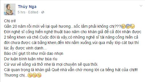 "Cứ vui vẻ sống và thở nhẹ là mọi chuyện sẽ qua thôi. Cái quan trọng là khán giả Quê nhà vẫn chờ mong lời ca tiếng hát của chị! Thương chị" - Thúy Nga tâm sự.