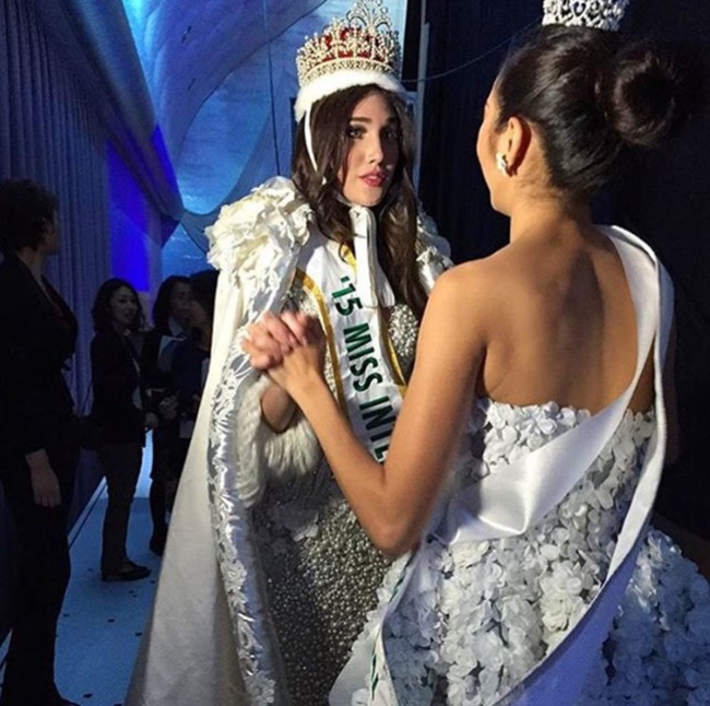 Thúy Vân chúc mừng tân Hoa hậu quốc tế 2015 Edymar Martínez. |