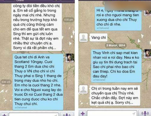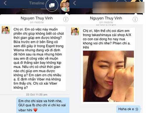 Theo những tin nhắn rò rỉ từ điện thoại của chị Ngọc, tháng 10/2013, Thúy Vinh nhờ chị Ngọc mua 2 món đồ bên Singapore gồm một đôi giầy và 1 chiếc đồng hồ với tổng số tiền là 328 đô (5,6 triệu VND).