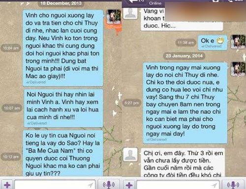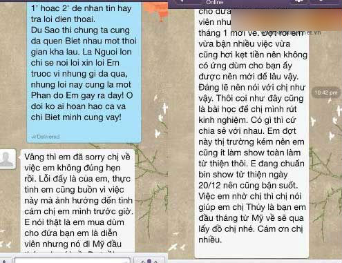 Với giọng điệu khá lịch sự, Thúy Vinh liên tục khất hẹn với lý do bận rộn chưa có thời gian, khi thì kẹt tiền. Có lúc Thúy Vinh lại nói mua giúp cho bạn là diễn viên, cô bạn này đi Mỹ chưa về nên chưa thể đến lấy đồ và trả tiền.