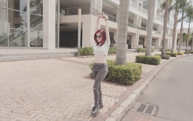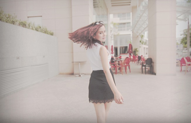 (ĐSPL) - Quán quân The Winner Is - Tia Hải Châu diện trang phục khỏe khoắn, năng động nhưng không kém phần gợi cảm khi rảo bước trên phố Sài thành.