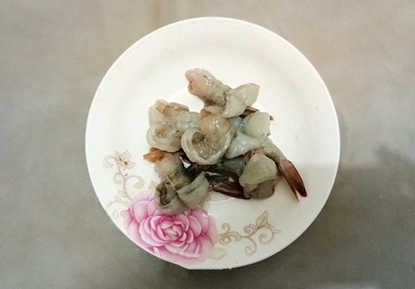- Bước 1: Tôm bóc bỏ vỏ, rửa sạch rồi cho vào bát. Thêm chút hạt tiêu, rượu nấu ăn và tinh bột vào trộn đều.