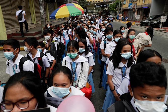 Học sinh đeo mặt nạ tới trường ở Philippines. |