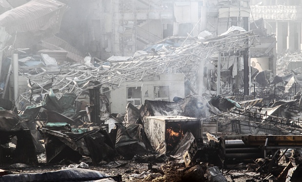Lửa vẫn bùng lên tại nhiều nơi trong vụ nổ tại Thiên Tân. Ảnh: Tân Hoa Xã |