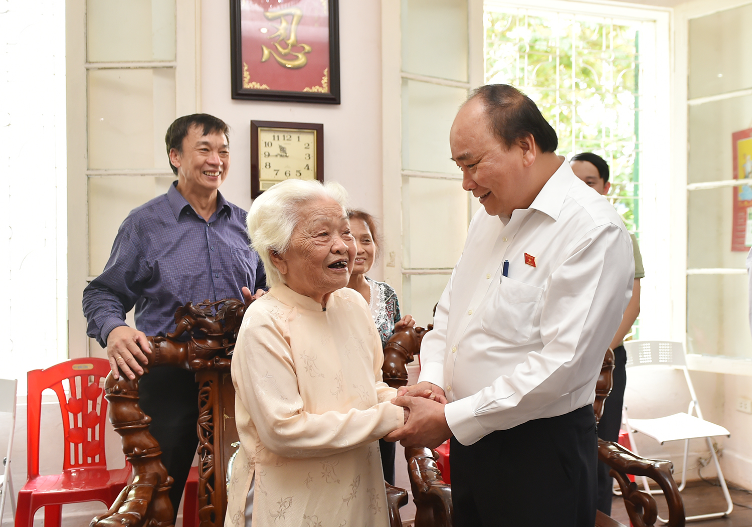 Thủ tướng Nguyễn Xuân Phúc thăm bà Nguyễn Thị Minh, sinh năm 1918, cán bộ lão thành cách mạng. Ảnh: VGP/Quang Hiếu |