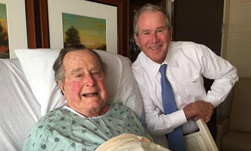 Cựu Tổng thống thứ 43 của Mỹ George W.Bush tới thăm cha trong bệnh viện ở Houston hồi tháng 4/2017. Ảnh: KBTX. |