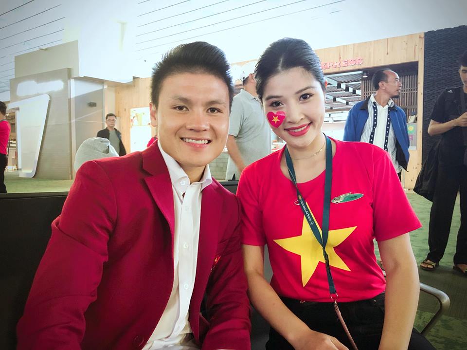 Trà My chụp ảnh lưu niệm cùng cầu thủ Quang Hải. |