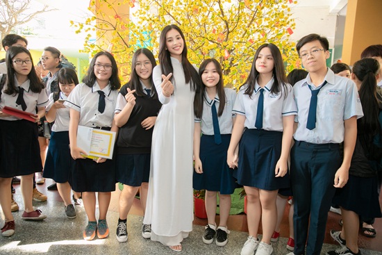 Nhân dịp sơ kết Học kì I của trường THPT Vạn Hạnh, Hoa hậu Tiểu Vy đã sắp xếp về thăm trường và trao phần thưởng cho các em học sinh giỏi. |