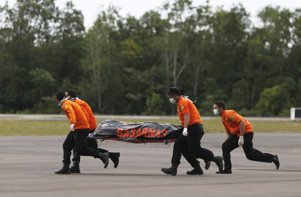 Thi thể các hành khách gặp nạn được đưa trở về bệnh viện ở Surabaya bằng máy bay. |