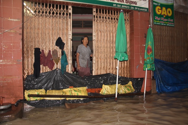 Mưa lũ khiến nhiều nhà dân phải chắn cửa ra vào để ngăn nước tràn vào nhà. (Ảnh Vnexpress) |