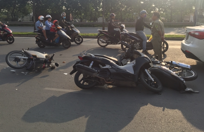 Sáng ngày 10/2, xe ô tô bốn chỗ do một phụ nữ khoảng 40 tuổi điều khiển lưu thông trên đại lộ Mai Chí Thọ theo hướng về hầm Thủ Thiêm. Khi cách giao lộ Lương Định Của khoảng 500 mét (phường An Phú, quận 2), chiếc xe này húc vào 4 xe máy chạy cùng chiều phía trước.