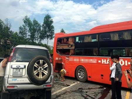Tại hiện trường vụ tai nạn giao thông, phần đầu xe khách và xe con đã bị hư hỏng nặng, một số người trên xe khách bị thương, chiếc xe khách nằm chắn ngang đường khiến giao thông qua khu vực ùn tắc nghiêm trọng.