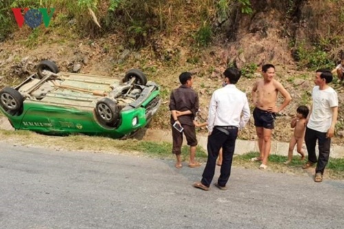 Do cả hai phương tiện đều đi với tốc độ nhanh nên lái xe taxi đánh lái mạnh khiến xe lật ngửa sang vệ đường.