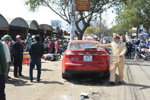 Chưa dừng lại, xe ô tô tiếp tục lao lên vỉa hè tông vào một phụ nữ bán trái cây và chị Huỳnh Thị Nga (30 tuổi, trú xã Hòa Thắng, TP.Buôn Ma Thuột) đang bán hoa.