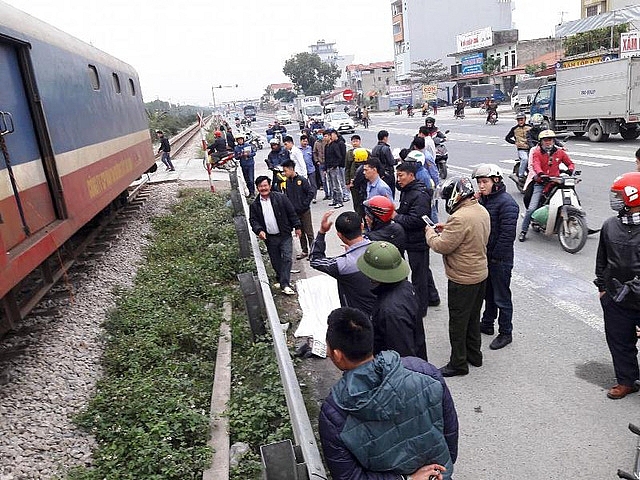 Bị đoàn tàu kéo lê hơn 20m, 2 người ngồi trên xe máy tử vong tại chỗ. Theo thông tin ban đầu cả 2 người đều trú tại thị trấn Vân Đình, huyện Ứng Hòa, Hà Nội.