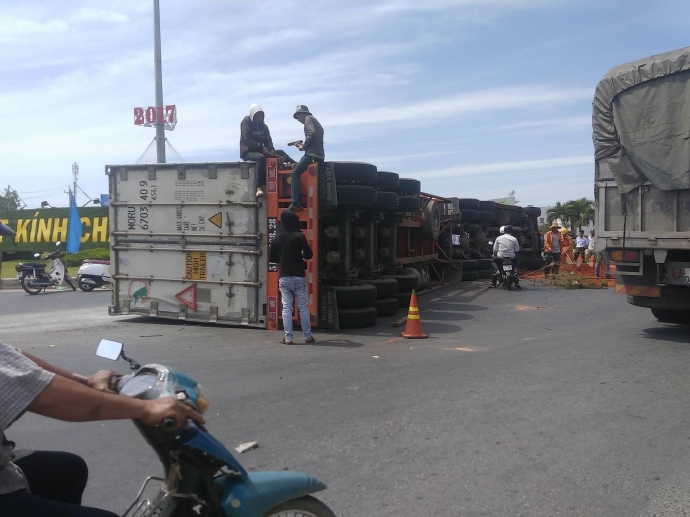 Khoảng 10h sáng 16/2, trên Quốc lộ 1A, đoạn qua vòng xoay phía Bắc TP. Phan Thiết (Bình Thuận) xe container mang biển số 51C – 851.44 kéo theo rơmooc 51R – 168.28 lưu thông trên quốc lộ 1A theo hướng Hà Nội - TP. Hồ Chí minh. Khi đến địa điểm trên, tài xế đánh lái để tránh một xe ô tô chạy cùng chiều cắt ngang phía trước khiến chiếc container lật nhào về bên trái và chắn ngang vòng xoay, phần đầu và hông trái xe bị hư hỏng.