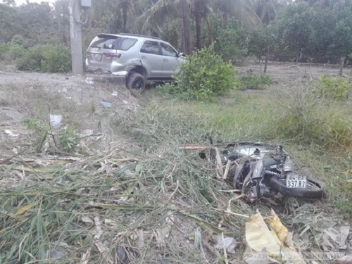Tại hiện trường, xe ô tô đã kéo lê xe máy khoảng 20 mét và dừng lại khi đâm vào cột điện ven đường, đầu xe ô tô bẹp dúm, xe máy biến dạng hoàn toàn, trên mặt đường còn để lại vết cày sâu và dài.