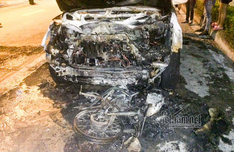 Chưa dừng lại ở đó, va chạm đã làm xe máy mắc kẹt dưới gầm ô tô và bị ô tô kéo lê gần 100m rồi bốc cháy. Gầm xe máy bốc cháy ngùn ngụt. Tại hiện trường, ô tô bị lửa thiêu rụi phần đầu, còn chiếc xe máy bị bốc cháy hoàn toàn. Trên mặt đường xuất hiện vệt cháy kéo dài.