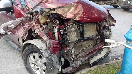 Cú đâm mạnh khiến chiếc xe bán tải bật ngược lại, quay ngang và nát phần đầu. Chiếc xe bồn đầu kéo cũng bị hư hại.
