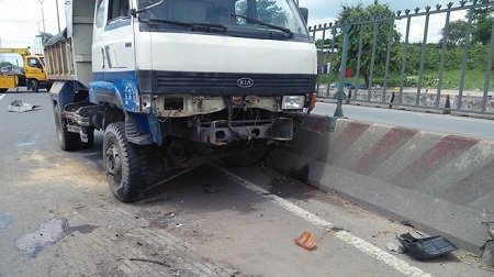 Xe ben tông xe buýt rồi lao vào dải phân cách