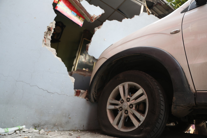 Tại hiện trường, kiot bán trà đá rộng khoảng 8m2 bị sập cửa và toàn bộ một bên tường. Chiếc ôtô nát phần đầu và nổ môt bên lốp. Thời điểm trên, kiot trà đá đang đóng cửa nên may mắn không có thiệt hại về người.