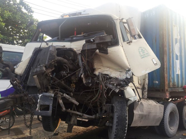 Cú tông mạnh khiến xế hộp bị đẩy về phía trước một đoạn dài rồi leo lên dải phân cách, phần đuôi xe bị hư hỏng nặng, kính chắn gió bể nát, hai người ngồi trên xe hoảng hốt la hét. Chiếc xe container hư hỏng nặng phần đầu, tài xế bị thương ở tay.