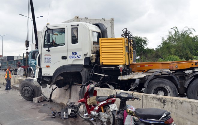 Chiều 23/6, xe đầu kéo biển số 83C kéo container chạy trên cầu cầu Phú Mỹ theo hướng quận 7 về quận 2 (TP HCM). Đang đổ gần hết dốc cầu thì xe đầu kéo bất ngờ tông vào xe tải BKS 51C. Phương tiện này sau đó mất lái lao qua phải tông vào dải phân cách cứng ngăn với làn xe máy.
