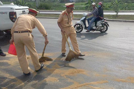 Phát hiện sự việc, tổ công tác của đơn vị đang tuần tra kiểm soát trên đường đã kịp thời huy động cán bộ, chiến sỹ cảnh báo, hướng dẫn giao thông, đồng thời xúc cát rải lên những điểm có vết dầu loang để chống trơn trượt.
