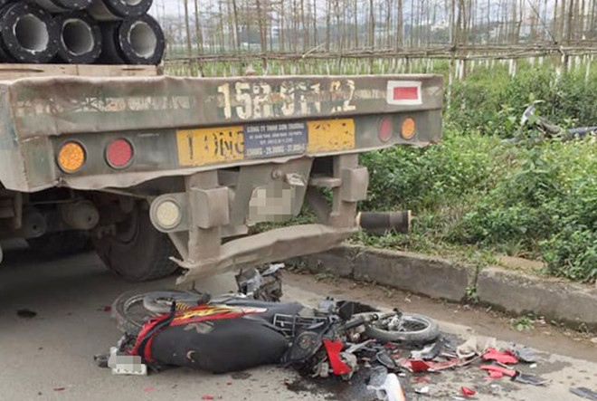 Lúc này, xe đầu kéo mang biển kiểm số Hải Phòng chở cột bê tông chạy lùi để vào đường chính thì tông trúng xe máy mang biển số tỉnh Phú Thọ chở 2 cô gái là Tống Thị Thuận và Phan Thị Ngọc Ánh (cùng 20 tuổi, ở huyện Xuân Trường, Nam Định).