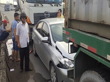 Khi vừa qua khỏi cầu Rạch Chiếc (thuộc phường An Phú, quận 2, TP Hồ Chí Minh) xe 4 chỗ bất ngờ bị xe bồn BKS 51E-037.80 lưu thông phía sau húc vào đuôi. Xe bồn đẩy xe 4 chỗ tông vào đuôi xe đầu kéo BKS 51D-056.42. Người đàn ông và thai phụ trên xe 4 chỗ hoảng hốt la hét cầu cứu sau đó bung cửa thoát ra ngoài.