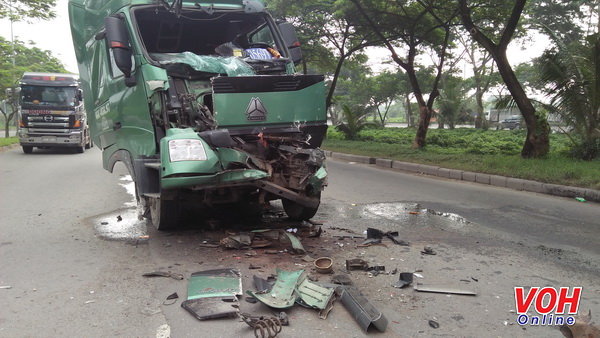 Cú tông mạnh khiến phần đầu cabin xe container biến dạng, nhiều bộ phận của xe văng ra khắp nơi, dầu nhớt đổ tràn ra đường. Tài xế chấn thương nặng, gục trong cabin, được người dân hỗ trợ đưa vào bệnh viện cấp cứu.