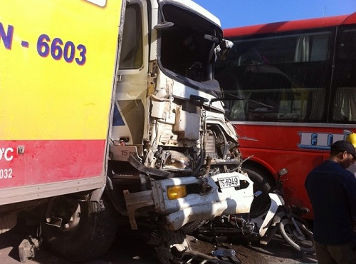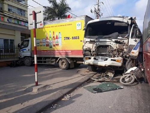 Xe tải chở bia BKS 37N - 6603 đang dừng chờ đèn đỏ theo hướng Hà Nội - Vinh thì bất ngờ xe tải BKS 37S - 6949 mất lái lao vào đẩy xe chở bia, tông xe khách phía trước và hai xe máy hai bên, cuốn cả 5 phương tiện dồn vào một cục khiến hai người trên xe máy nguy kịch, lái xe chở bia chấn thương nặng.