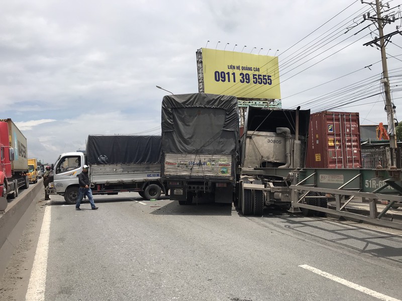 Cùng lúc này, xe container 57K-9128 cũng đang lưu thông phía sau không xử lý kịp nên đã tông liên hoàn vào ba xe. Vụ việc khiến một tài xế bị thương phải nhập viện cấp cứu, ba xe tải bị ủi văng, hai xe xoay ngang đường, các xe đều hư hỏng.