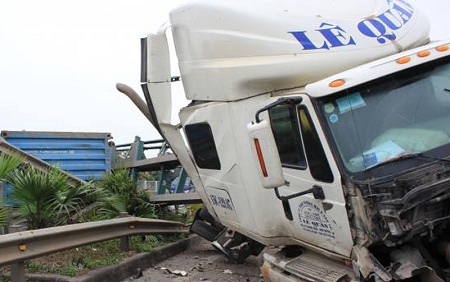 Xe container đâm ô tô chở công nhân, 5 người bị thương. Ảnh Infonet. |
