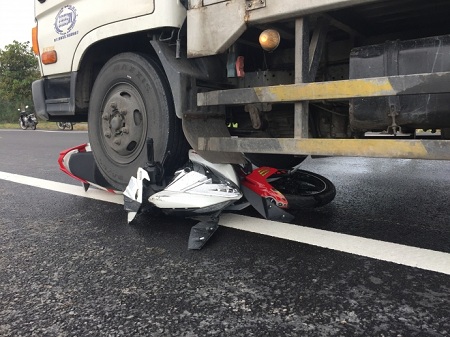 Sau cú đâm mạnh, xe tải và xe máy lao tới phía trước một đoạn gần 50m về phía làn đường ngược chiều, khiến nhiều phương tiện di chuyển khó khăn. Tại hiện trường, chiếc xe máy nằm gọn trong lòng xe tải nát nghiến phần đầu xe, nhiều bộ phận biến dạng, trên đường nhiều bộ phận xe văng ra ngoài. Cú va chạm khiến một cụ bà bị thương nặng được chở đi cấp cứu ngay sau đó.