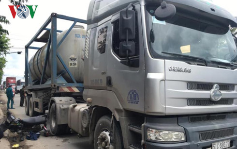 Khi đến đoạn thuộc khu phố 2, phường An Phú (TX Thuận An, Bình Dương), xe máy bất ngờ bị trượt bánh khiến 2 người trên xe ngã ra đường. Lúc này, chiếc xe đầu kéo chở bồn mang BKS 51C – 686.xx (chưa rõ danh tính tài xế) lưu thông cùng chiều lao tới, tài xế không xử lý kịp nên đã cán qua người 2 thanh niên.