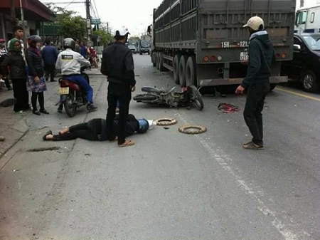 Tại hiện trường vụ tai nạn giao thông, chiếc xe máy bị hư hại nằm trên đường, một nạn nhân bị bánh xe tải cuốn vào gầm biến dạng, cách đó không xa một nạn nhân khác đang nằm bất tỉnh. Hiện danh tính nạn nhân vụ tai nạn giao thông vẫn chưa được xác định.