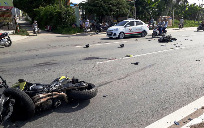 Tại hiện trường, hai xe máy nằm cách nhau hơn 20m, hư hỏng, biến dạng, nhiều mảnh vỡ của hai phương tiện, nón bảo hiểm của các nạn nhân vương vãi khắp mặt đường.