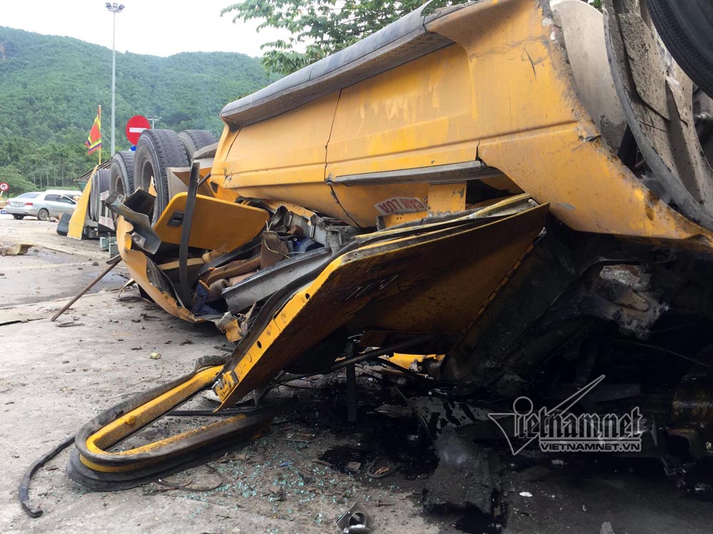 Tại hiện trường, toàn bộ cabin xe container nát bét, mảnh vỡ tứ tung. Toàn bộ container cùng rơmooc chắn ngang một chiều trên quốc lộ gây ùn tắc khoảng gần 1 tiếng.
