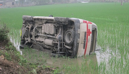 Xe cứu thương lật xuống ruộng, dân đập kính cứu người