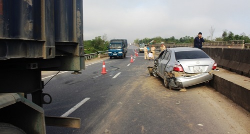 Ghi nhận của PV Báo Giao thông tại hiện trường, xe ô tô đầu kéo chỉ xước nhẹ phần đầu bên trái, còn xe ô tô 4 chỗ xoay chiều ngược lại theo hướng Huế-Quảng Trị và “dính” vào đoạn bê tông chân dải phân cách QL1 trong tình trạng hư hỏng nặng cả phần đầu và đuôi xe.