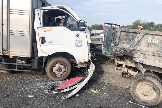Cú tông khiến cabin xe tải Đồng Nai biến dạng, tài xế bị thương và kẹt bên trong, phải nhờ tới sự trợ giúp của người dân để đưa đi cấp cứu. Giao thông trên cao tốc ùn tắc hơn 2 km.