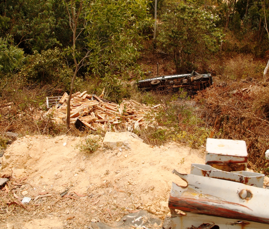 T?i hi?n tr??ng, tr??c khi lao xu?ng v?c, chi?c xe ?� ?�m ??t m?t ?o?n taluy ???ng b?ng s?t d�i 5 m�t. Sau ?�, chi?c xe t?i l?n nhi?u v�ng, h? h?ng n?ng, to�n b? th�ng xe, k�nh ch?n gi� v? n�t, h�ng t?n g? ?? v??ng v�i kh?p n?i.