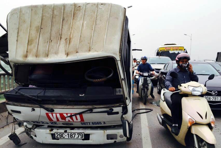 T?i hi?n tr??ng, ?o?n d�i lan can b?ng s?t b? nh? tung kh?i tr? b�-t�ng ph�a d??i. Chi?c xe t?i h? h?ng n?ng ph?n ??u b�n ph?i, b�nh tr??c tung ra. T�i x? xe t?i b? th??ng n?ng, ???c ng??i d�n ??a ?i c?p c?u ngay sau ?�.