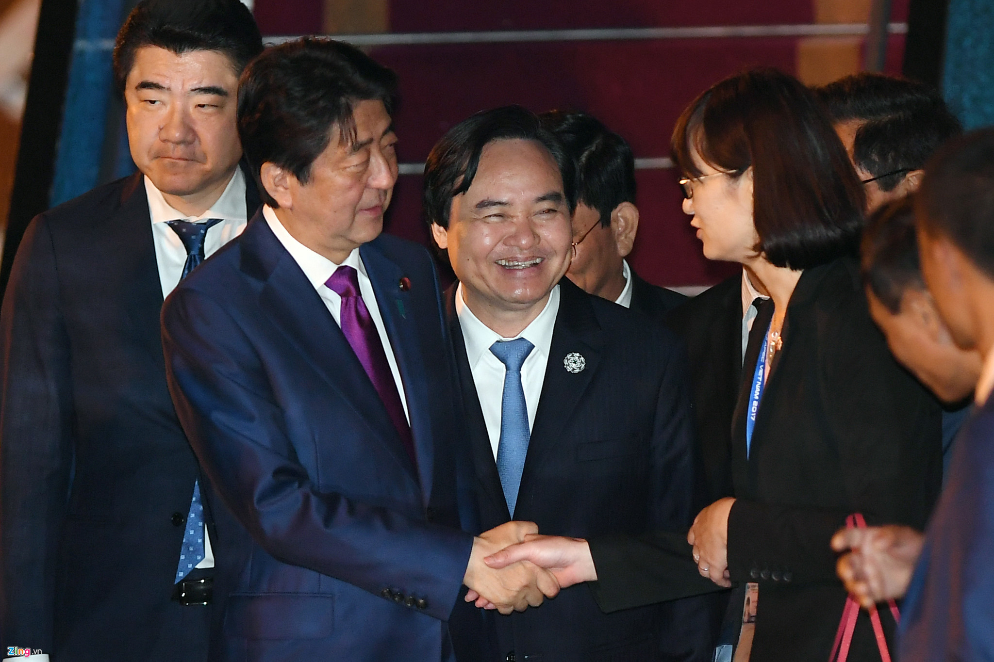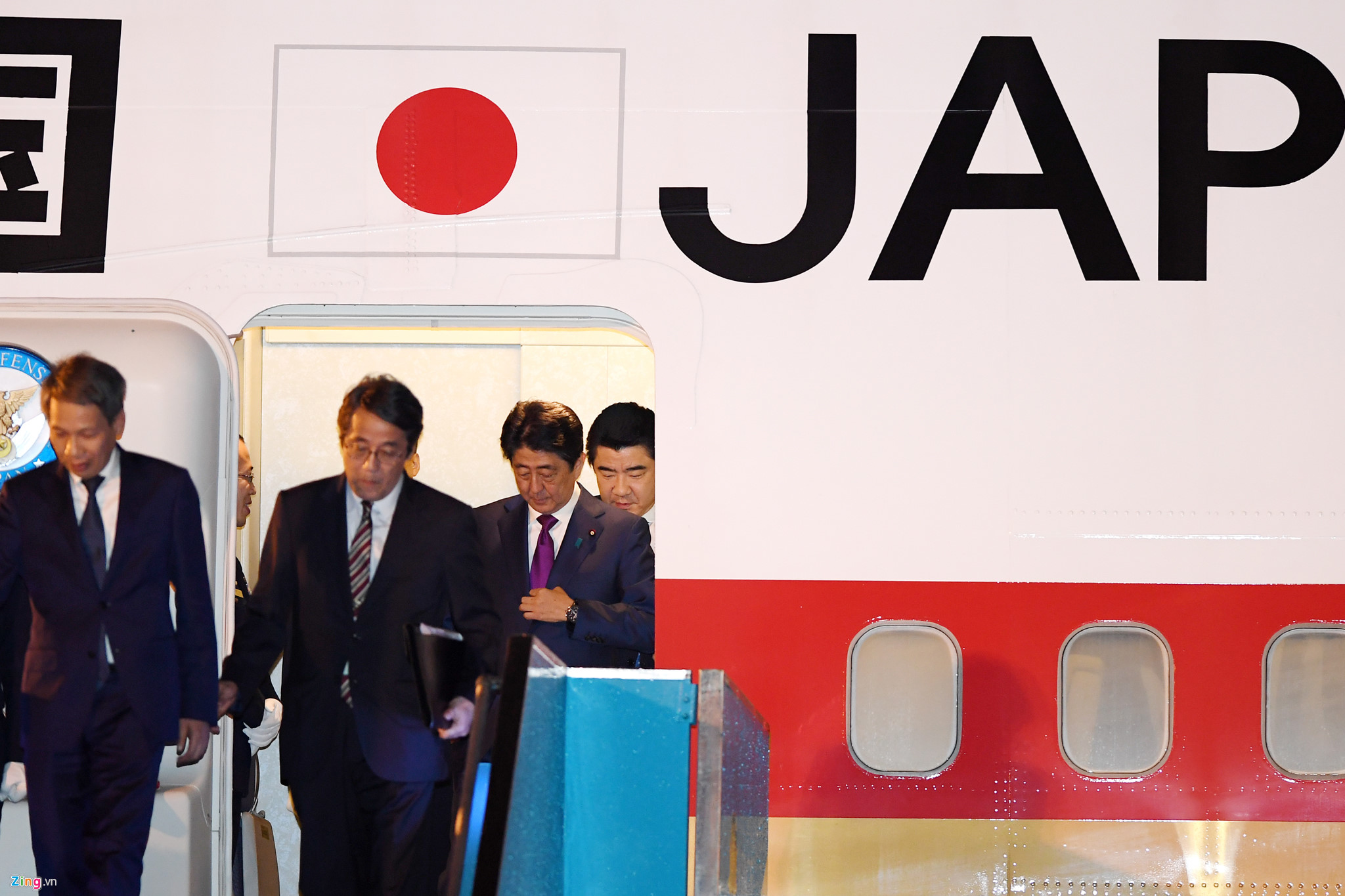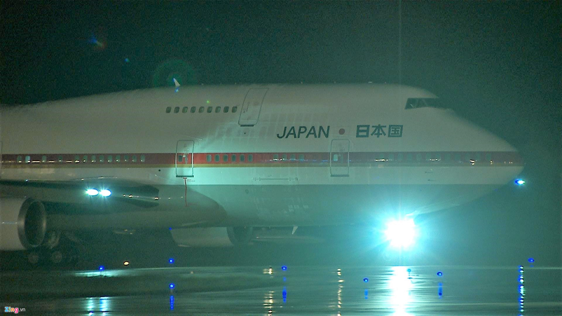 21h03, cửa chuyên cơ mở ra. Thủ tướng Shinzo Abe bước ra. Ông Abe mặc bộ vest lịch lãm màu đen cùng cà vạt màu tím. Thủ tướng Abe bước trên thảm đỏ xuống chân xe thang, nơi có các quan chức Việt Nam đang chờ đón.