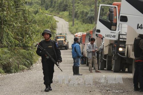 Cảnh sát tuần tra tại khu vực mỏ Grasberg ở Papua, Indonesia. Ảnh: AFP/TTXVN. |