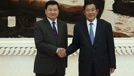 Thủ tướng Hun Sen (phải) bắt tay người đồng cấp Lào Thongloun Sisoulith trong cuộc gặp tại Phnom Penh hồi tháng 5 (Ảnh: Phnompenh Post) |