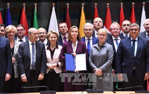 Đại diện Cấp cao phụ trách chính sách an ninh và đối ngoại EU Federica Mogherini (giữa) sau lễ ký - TTXVN. |
