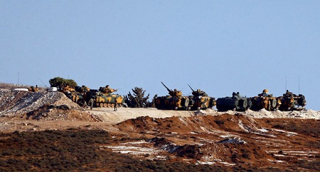 Xe tăng Thổ Nhĩ Kỳ được nhìn thấy trên tuyến biên giới Syria-Thổ Nhĩ Kỳ ở Reyhanli, tỉnh Hatay, Thổ Nhĩ Kỳ. Ảnh: REUTERS |